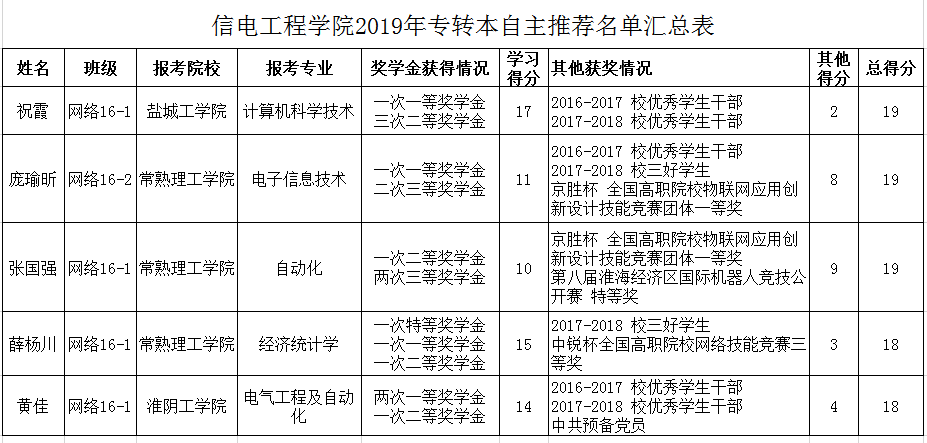 根据《省教育厅关于做好2019年“专转本”工作的通知》(苏教学﹝2018﹞6号文)、《省教育厅关于做好2019年普通高校“专转本”自主招生工作的通知》(苏教学﹝2018﹞7号文)以及《三亿体育官网2019年“专转本”自主招生推荐工作实施办法》的具体要求,在考生自愿报名的基础上,经班主任推荐,公司初审后,拟报送以下同学参加公司2019年“专转本”自主推荐选拔: