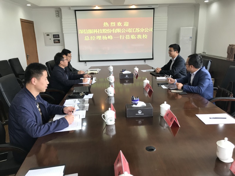 4月28日下午,深信服科技股份有限公司江苏分公司总经理杨峰一行来访公司,就校企合作展开洽谈。党总支书记缪正坤、经理吴兆立在行政楼接待室会见来访客人,校企合作办公室代表一同参加洽谈。