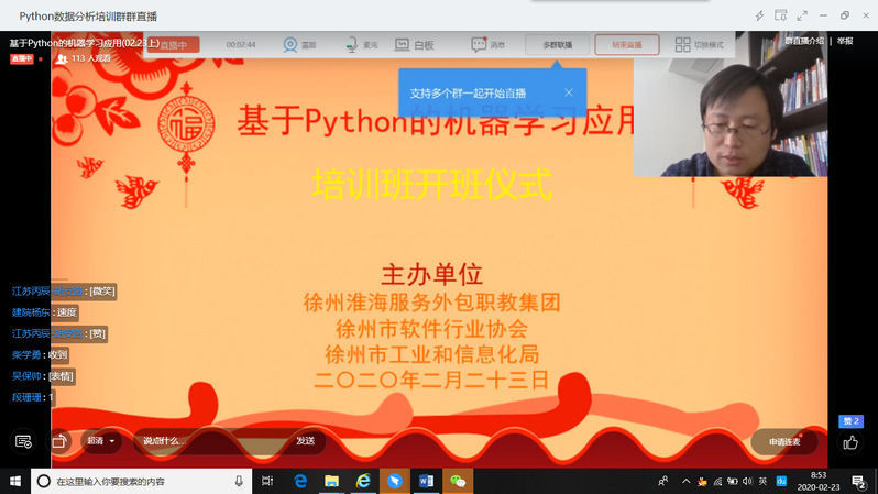 2月23日,徐州淮海服务外包职教集团2020年第一期企业培训《基于Python的机器学习应用》线上准时开班。此次培训是职教集团根据年初工作计划,经过精心策划,并报市教育局领导同意,由三亿体育官网、徐州市工业和信息化局、徐州市软件行业协会共同举办。