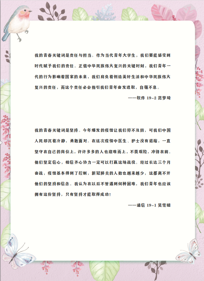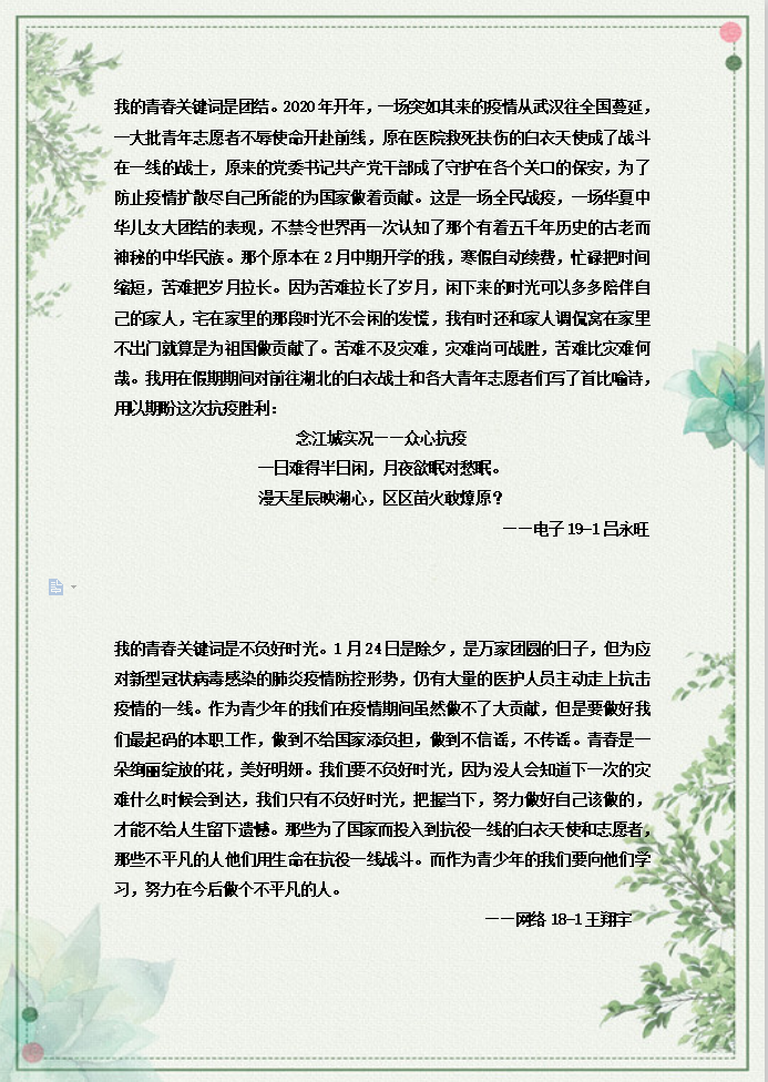 “90后”抗疫人员身上的勇敢、拼搏、责任和担当无不彰显着青春的力量。身为青年学子,同学们没有战斗在一线,但他们依然心系前线。今年的五四,信电学子在感叹青春易逝珍惜韶华的同时,又多了几分不一样的感慨。大家纷纷报名踊跃投稿,书写他们在战疫之年对于青春的独特思考。