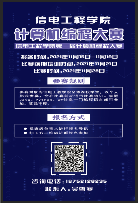 各班负责人统计报名人数2021年11月18日晚20点之前将报名电子稿发给社团工作部部长:吴雪寒