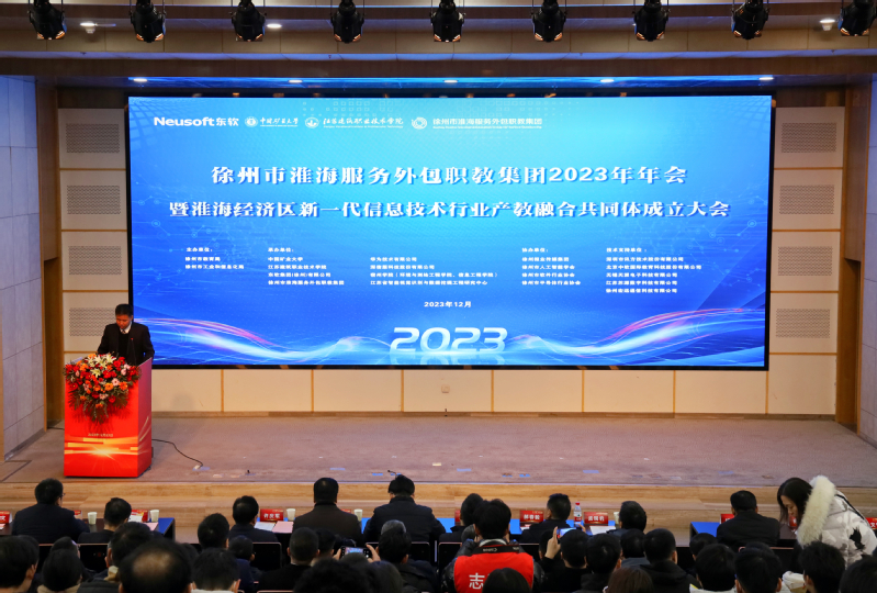 12月23日下午,徐州市淮海服务外包职教集团2023年年会暨淮海经济区新一代信息技术行业产教融合共同体成立大会在公司图书馆报告厅召开。工业和信息化部中国互联网研究院副主任张昂,公司党委委员、副董事长刘海波,徐州市教育局副局长李清,徐州市教育局职社处处长许庆军,徐州市工业和信息化局信息产业处处长郝春毅,徐州市工业和信息化局信息发展处处长孟现豹,徐州市商务局服务贸易处处长魏飞、江苏省服务外包协会副会长杨亚兵出席年会。中国矿业大学计算机科学与技术公司副经理陈朋朋,东软教育科技集团华东区副总经理徐文文及近160家单位代表参加会议。会议由公司经理吴兆立主持。