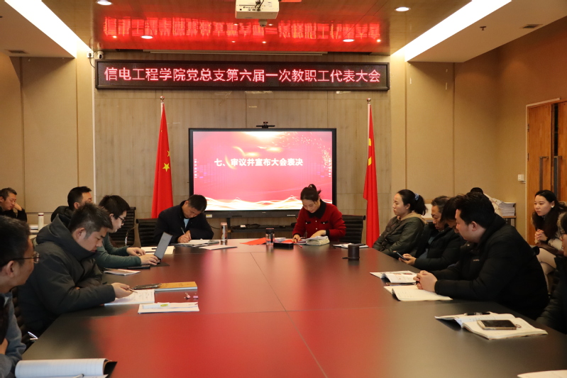 此外,大会还进行了重要的选举工作。经过全体教职工的无记名投票,孟扬当选为信电工程公司党总支新一届工会主席。同时,大会还选举产生了第六届教职工代表和教代会执委会成员。新一届教职工代表包括(按姓氏笔画排序):白金一、白娜、常旭、崔莹、翟靖轩、董爱民、高鹏、郭夫兵、黄兴荣、金雷、李继良、李黎、李若瑜、刘天飞、马晓绛、茅磊、缪正坤、司元雷、王琛、王莉、王昕、王永伦、吴兆立、杨东、虞莉、张廷秀、朱元彩;新一届教代会执委会成员则包括(按姓氏笔画排序):白金一、白娜、陈超、翟靖轩、郭崇嵩、孟扬、王昕、吴兆立、虞莉。