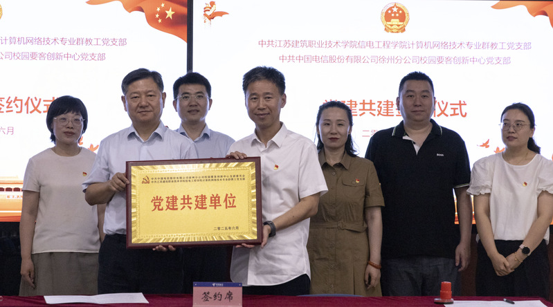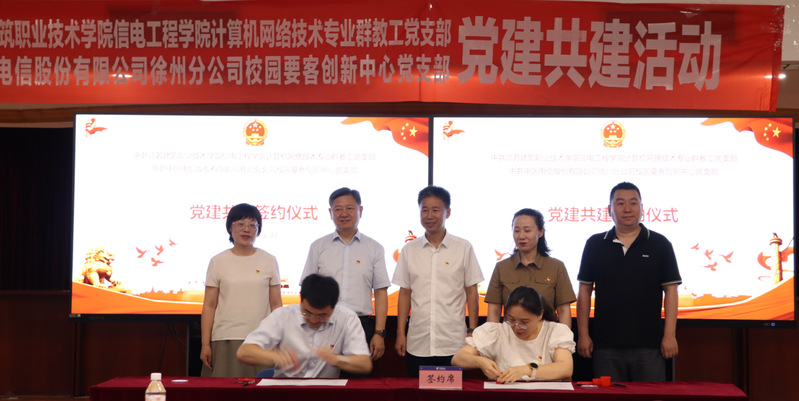 在全体党员的共同见证下,公司计算机网络技术专业群教工党支部书记白娜与徐州电信校园要客创新中心党支部书记王跃代表双方签署了《党建共建协议书》。协议明确双方将在组织联建、党员联育、活动联办、资源联享、发展联促等方面开展深度合作,共同打造校企党建共建示范品牌。公司经理吴兆立为共建单位授牌,标志着双方正式建立党建共建关系。